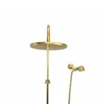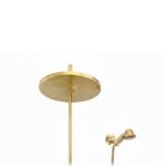 • Suitable for outdoor installations (poolside showers, gardens, spas) and luxury bathrooms, the fixture ages naturally through exposure to water and air. The brass surface develops rich patina transitioning from bright gold to warm amber and bronze tones, while the copper rainfall head deepens from bright copper to verdigris and turquoise-green hues. This dual-metal evolution creates depth and visual interest unique to each installation’s environmental conditions.